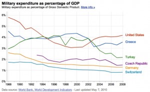 Greece, because of its ongoing hostilities with Turkey, has an extremely high military budget: In 2008, Greece spent roughly 10 billion US$ on its military (2). Military spending as a percentage of gross domestic product – 3.55% – is higher than in any other country in Europe.